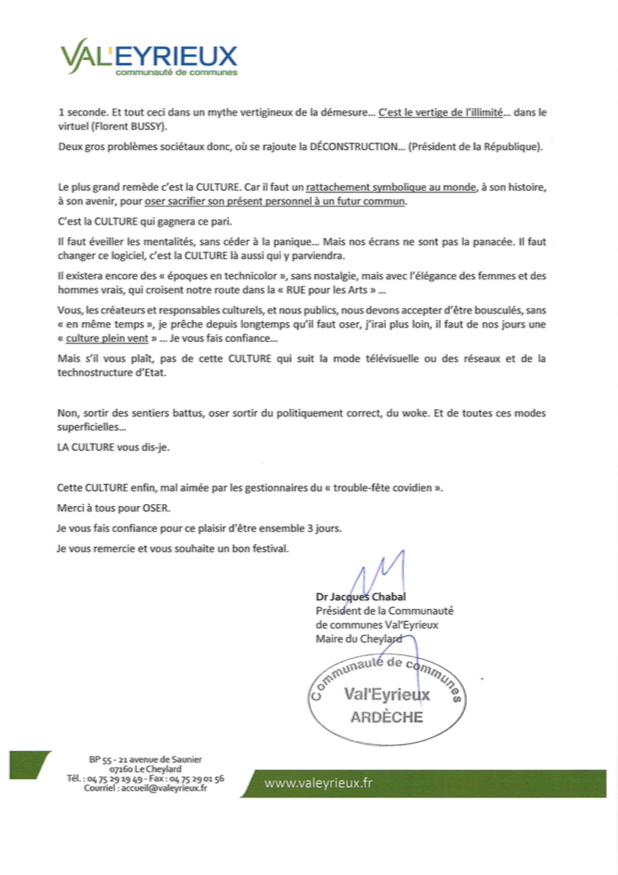 27 décembre 202127 décembre 2021 par jacqueschabal « La Culture en territoire rural, une réalité indispensable » – Discours d’ouverture de l’Estival 2021, Dr Jacques CHABAL Partager : Partager sur X(ouvre dans une nouvelle fenêtre) X Partager sur Facebook(ouvre dans une nouvelle fenêtre) Facebook J’aime chargement…